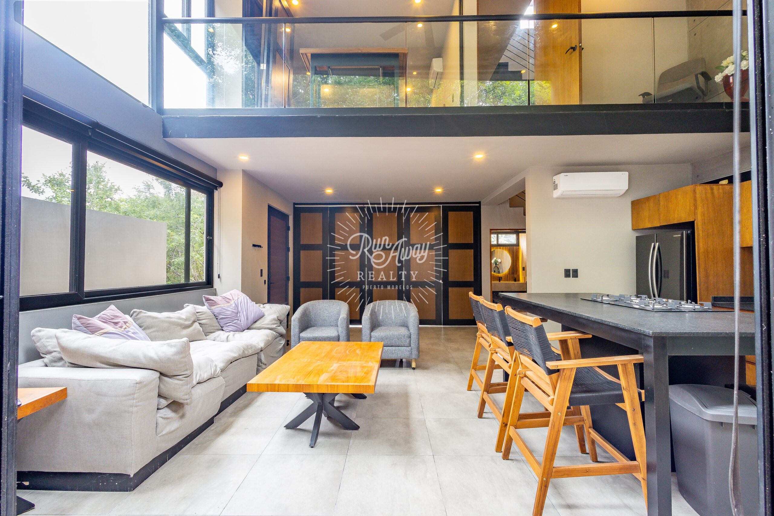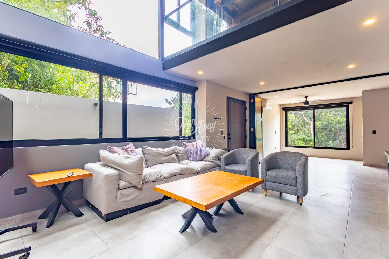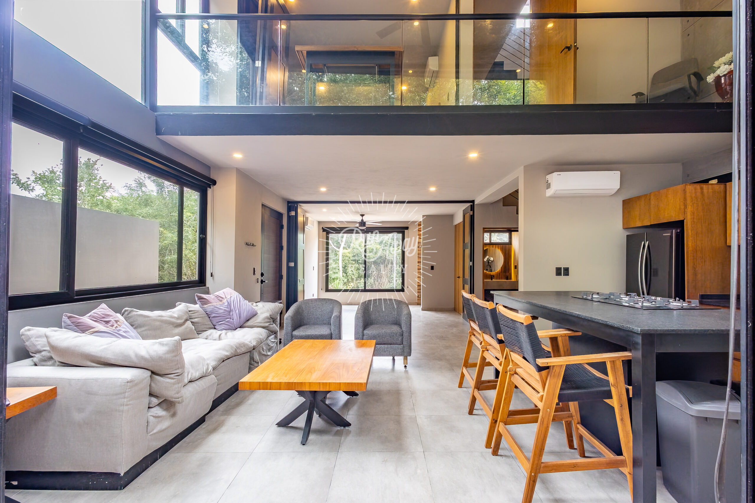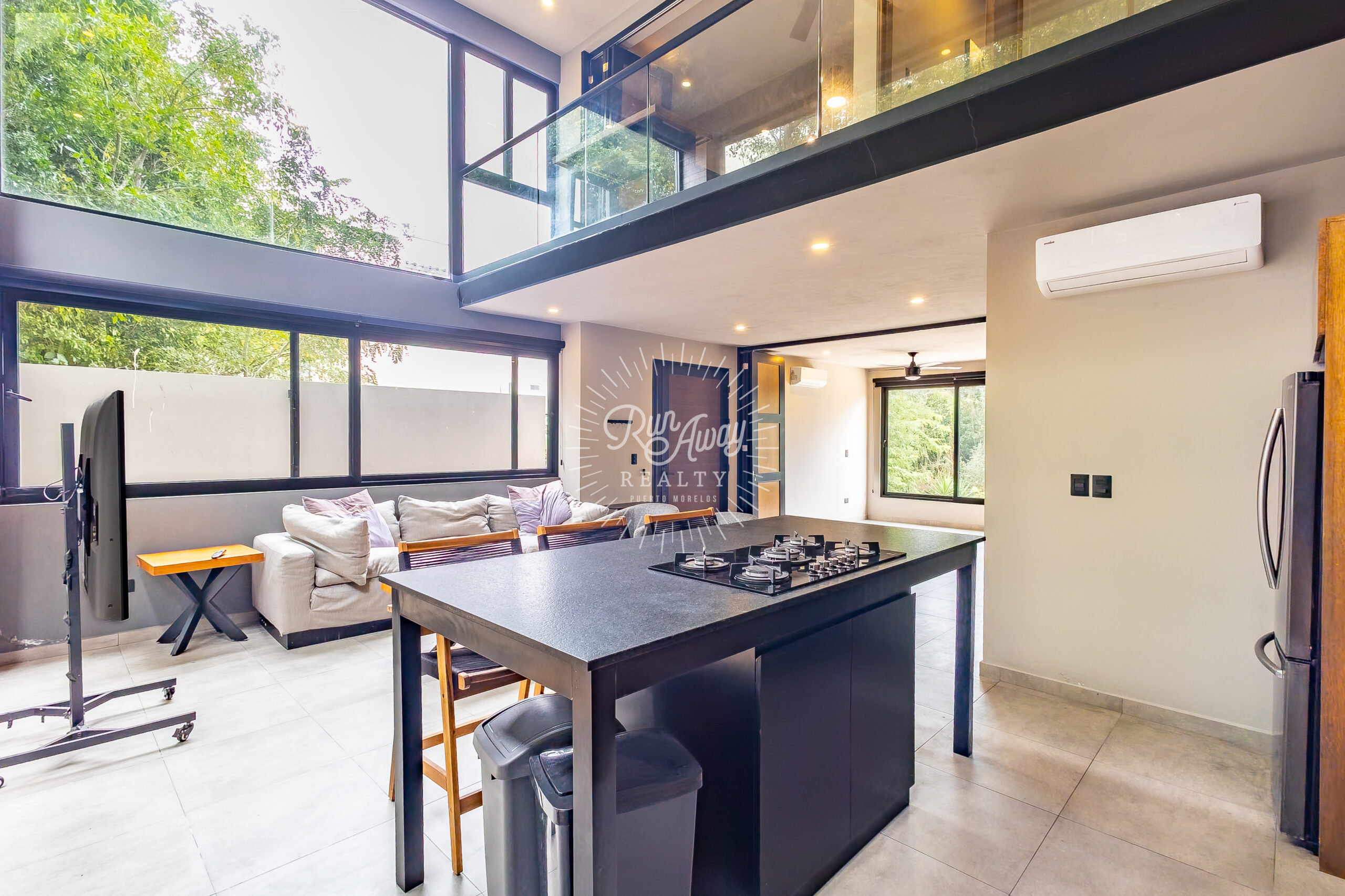 From the moment you step inside, this home invites you to slow down and breathe. A dramatic double-height great room opens before you, where the kitchen, living, and dining spaces flow together beneath soaring ceilings and two full stories of windows. Sunlight pours in, tropical breezes drift through, and lush palms just beyond the glass create a constant connection to the natural beauty of Mexico.