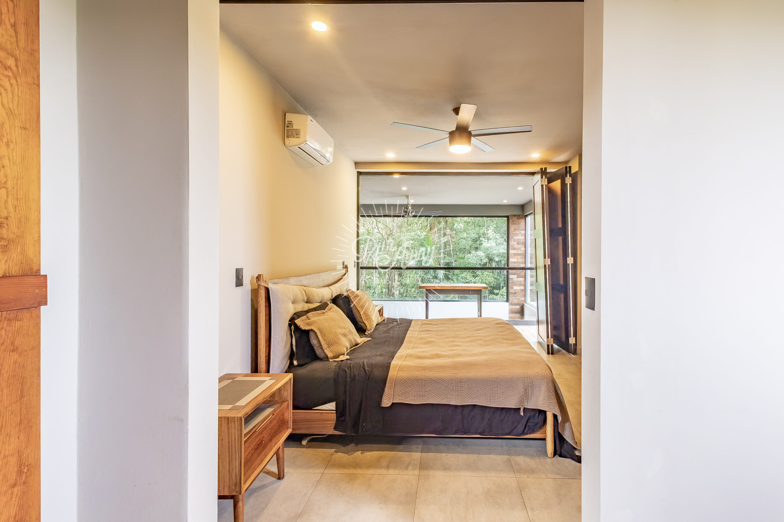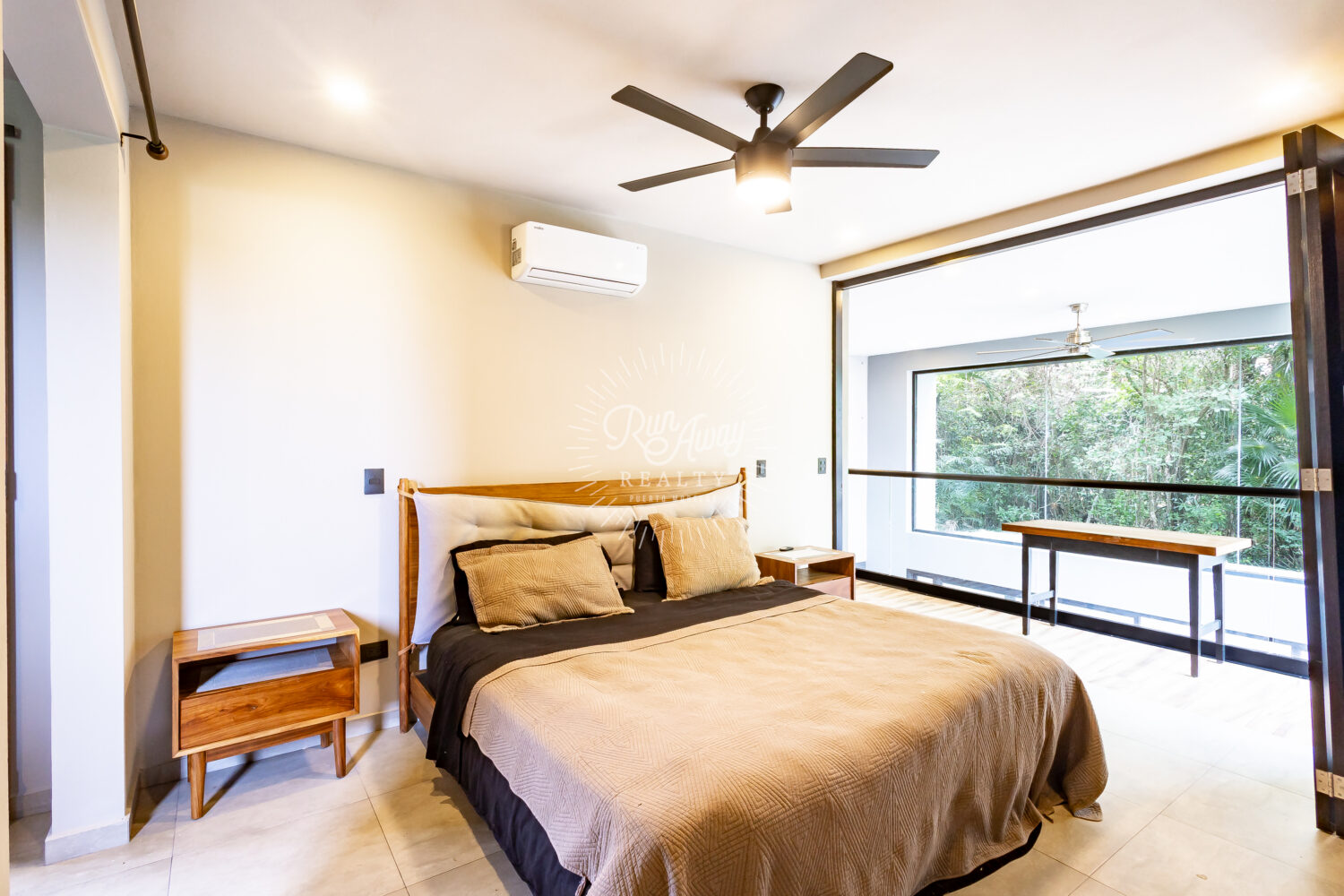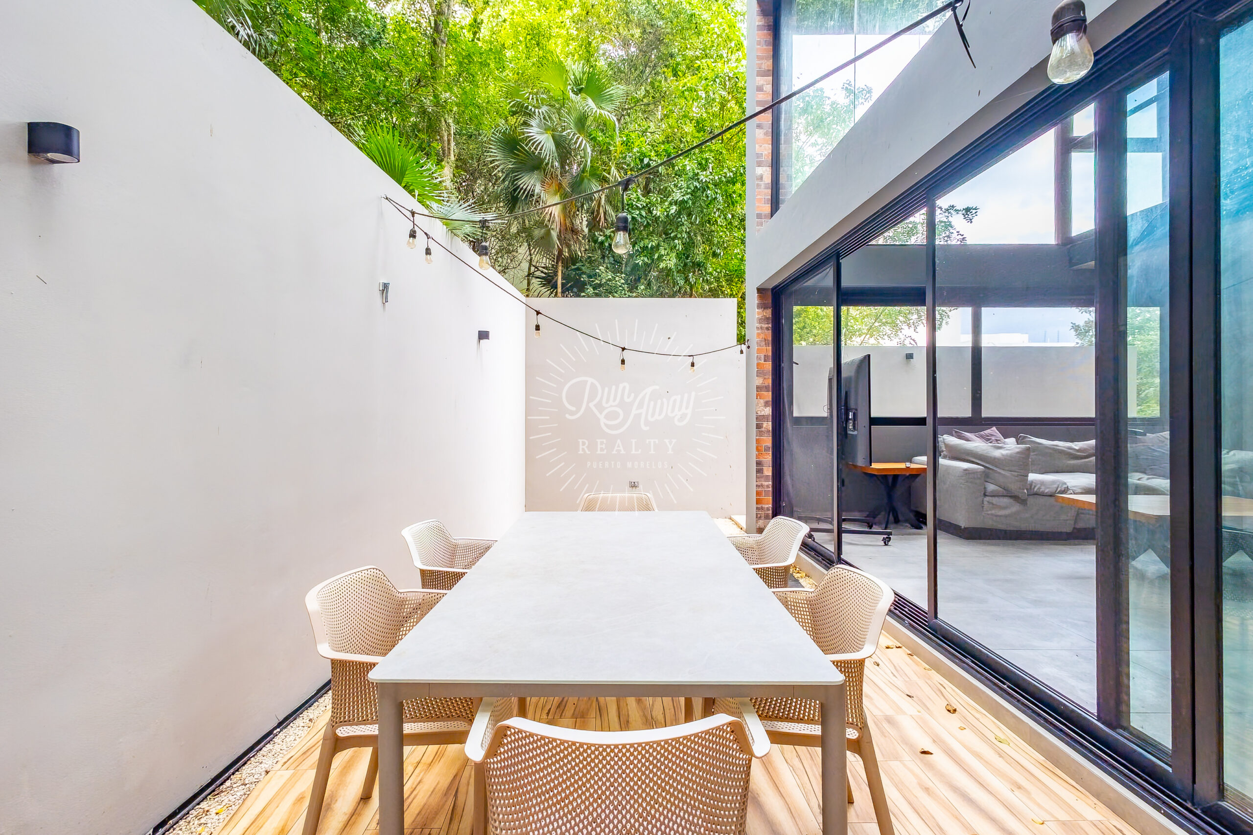 The entire living area opens wide to the terrace, blurring the line between indoors and out. Imagine morning coffee with the sound of rustling palms, long afternoons filled with light and air, and evenings spent entertaining as the sunset filters through the trees.