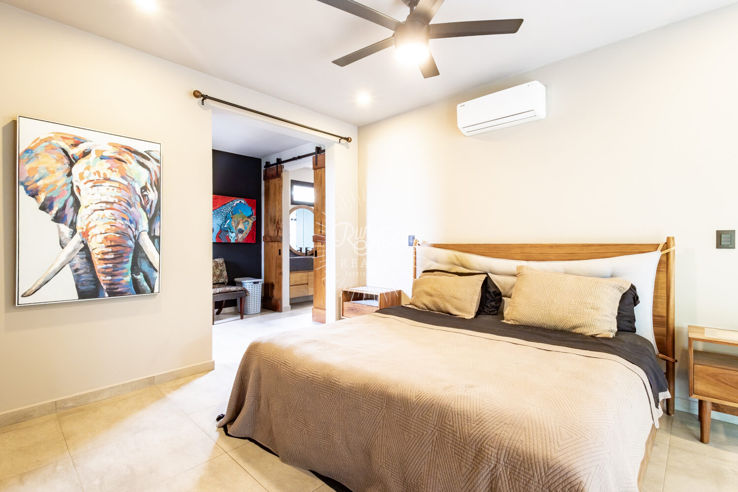 On the second level you'll find a lofted terrace and the primary bedroom. With a subtle visual connection to the living and kitchen areas below, the home’s cohesive contemporary design is enhanced while remaining a peaceful retreat — ideal for unwinding after a day at the beach or a refreshing swim. This room features a king size bed, a large walk in closet and a spacious bathroom, with plenty of natural light.